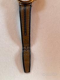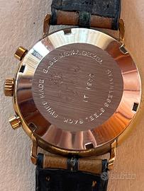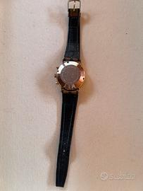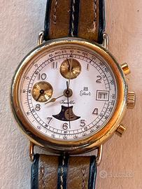 In vendita splendido cronografo vintage della casa svizzera Evilard, un pezzo di grande eleganza che unisce la precisione del cronografo meccanico al fascino della complicazione con fasi lunari. L'orologio incassa il prestigioso movimento Valjoux 7768 a carica manuale, un calibro "instancabile" e molto ricercato dai collezionisti per la sua affidabilità e la particolare disposizione del quadrante. CARATTERISTICHE TECNICHE: Movimento: Meccanico a carica manuale, calibro Valjoux 7768 (Swiss Made). Complicazioni: Cronografo a due contatori, datario a ore 3 e indicazione delle fasi lunari a ore 6. Sistema di Protezione: Dotato di sistema anti-urto Incabloc (visibile sul quadrante). Cassa: Elegante finitura laminata in oro giallo con pulsanti cronografici "a pompa". Quadrante: Bianco ceramica con numeri arabi, scala tachimetrica esterna e sfere brunite/dorate. Cinturino: In pelle con doppia banda centrale, perfetto per lo stile vintage del pezzo. CONDIZIONI: L'orologio è usato e funzionante. La cassa conserva bene la sua placcatura originale, con i normali segni del tempo che ne testimoniano l'autenticità. Il cronografo parte e si azzera correttamente.