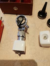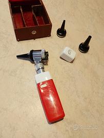 Otoscopio tascabile Heine, portatile, a batteria. È composto da 5 pezzi più una custodia. Teoricamente funziona, ma le batterie sono scariche, anche se non sono riuscito ad aprirlo