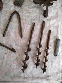 Lotto di antichi oggetti in ferro composto da: tre portalampade, tre punte per trapano a mano, due chiavi, un apri-bottiglia Recoaro, uno schiaccianoci, due lucchetti senza chiave.