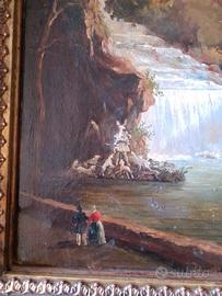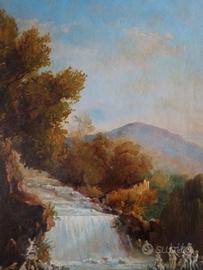 Ottimo paesaggio dell’Ottocento, di Giacinto Gigante (firma in basso a destra), il più importante pittore della scuola di Posillipo. Il dipinto raffigura la fontana monumentale di Diana e Atteone nel parco della Reggia di Caserta. Il dipinto è incorniciato da una splendida cornice neoclassica rifinita in foglia d’oro zecchino con lucidatura a specchio, molto ben conservata. Il dipinto è venduto a seguito di eredità e fu acquistato in casa d’aste e già parte di importante collezione privata siciliana. Misure: 28 x 41 cm (con cornice: 42,5 x 55 cm) Le foto rappresentano il bene così come venduto. L’oggetto presenta i normali difetti di un’opera antica.