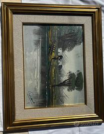 "Quadro paesaggistico materico firmato Romano.Raffigura una scena bucolica con casa e lago. Colori vivaci e pennellata decisa.