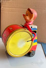 Questo è un giocattolo vintage in latta, probabilmente prodotto in Giappone negli anni '30 o successivamente, raffigurante un suonatore di tamburo a carica. Materiale: Latta litografata con parti in plastica o gomma. Meccanismo: Funzionamento a carica (wind-up) che fa muovere le braccia per suonare il tamburo