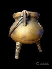 Descrizione: Elegante tripode in bronzo dorato, probabilmente un braciere decorativo, un incensiere oppure un vaso rituale/statuario in stile neoclassico o rinascimentale. E' tondeggiante, simile a un calderone e di bronzo con un grande rilievo centrale e sui piedi. Il corpo globulare presenta un rilievo centrale raffigurante un gruppo di figure mitologiche danzanti attorno a una figura centrale, probabilmente una scena di ispirazione bacchica o allegorica.