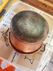 Bellissimo paiolo in rame, usato ma in. buone condizioni. Segni di usura dovuti al tempo e utilizzo. Diametro 24 cm, altezza 15.cm circa. Fondo bombato per cottura su stufa, putagé.