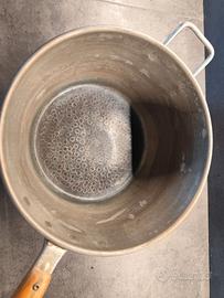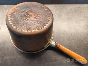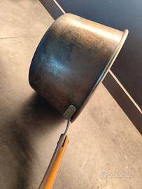 paiolo in rame con manico in legno - per polenta - dimensioni: diametro 31 cm - lunghezza 60,6 cm (con il manico) - altezza 16,5 cm - peso 1.380 g
