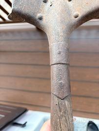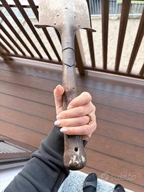 Vendo pala militare d’epoca, probabilmente italiana, completa di manico originale in legno. La pala si presenta in condizioni autentiche, con segni del tempo e ossidazione che ne testimoniano l’utilizzo e l’età. Struttura solida, senza rotture importanti, ideale per collezionisti, appassionati di militaria o per arredo vintage/industriale. Il manico è originale e ben saldo, con normale usura. Presente anche piccolo segno/punzonatura sulla parte metallica, non perfettamente leggibile. 🔹 Oggetto originale, non replica 🔹 Condizioni come da foto 🔹 Perfetta per collezione o esposizione