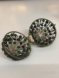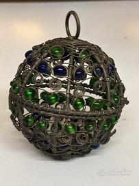 Piccola sfera o "gabbia" apribile in metallo in metallo argentato decorata con perline di vetro di colore blu e verde , apribile a metà grazie a una cerniera.