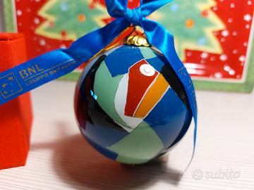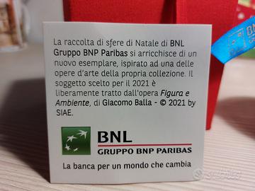 Sfera / Palla di Natale BNL anno 2021, originale da collezione, in vetro opalino con cartellino descrittivo.
