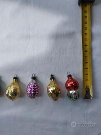 Vendo accessori in vetro soffiato, anni 60, per addobbi Natalizi. Alcune palline, presentano piccole sbeccature , peraltro nascoste dai fermagli in dotazione . Piccole mancanze di colore dovute agli anni trascorsi. Spese a carico del destinatario.