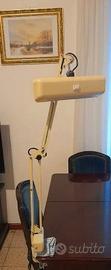 Palmino Longoni – Rimsa – Lampada Industriale a pantografo – Anni 60. Alta estesa cm 110, lampada lunga cm 32 larga cm 9. RIMSA, costituita nel 1936 da Palmino Longoni, all’origine officina meccanica, sviluppò tipologie di prodotto in stretta relazione all’evoluzione della domanda dell’epoca fino ad individuare il prodotto principale su cui improntare il proprio futuro: “braccio portalampada a pantografo“. Lo sviluppo dell’azienda determinò l’ampliamento della gamma di articoli prodotti e la ricerca di nuove applicazioni quali bracci portalampade con lente d’ingrandimento e con luce fluorescente da impiegare nel settore elettronico, orafo, odontotecnico, estetico ed industriale.