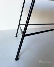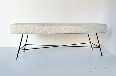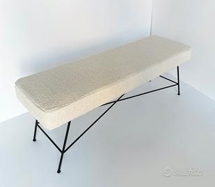 Particolare panca anni '90 con struttura in ferro verniciato nero e rivestimento della seduta in soffice bouclé bianco panna. Dimensioni: L 135 x P 42 x H 48 cm Provenienza: Italia Epoca: Anni 90