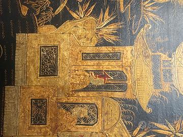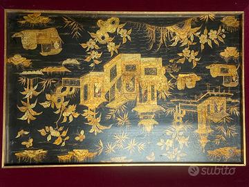 Elegante pannello decorativo cinese laccato, con dorature piatte su fondo nero, raffigurante paesaggio con architetture tradizionali.