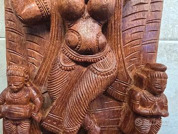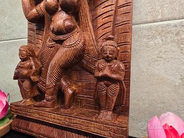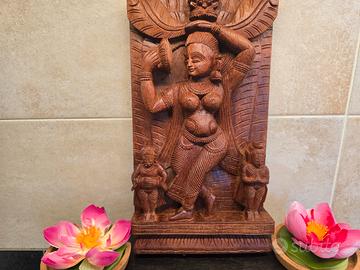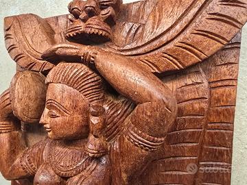Questo pannello cattura la grazia della tradizione orientale. Al centro, una Apsara (ninfa celeste), è colta nella classica posa di danza Tribhanga, la triplice flessione del corpo che esprime equilibrio tra movimento e stasi. L’opera colpisce per come la figura emerga con forza dal fondale ligneo. Il dettaglio magnetico è il volto inclinato a tre quarti, che conferisce allo sguardo un senso di movimento e profondità introspettiva. Sopra di lei vigila il potente Kirtimukha, il "Volto della Gloria": guardiano leonino che, nel simbolismo vedico, protegge la figura e scaccia le negatività. Ai piedi della danzatrice, due musici e devoti completano la narrazione sacra. Un pezzo di design dal carattere materico Esempio eccellente di artigianato indiano in legno massello dalle tonalità calde. Con dimensioni di 31x17 cm e uno spessore di 5 cm, vanta un alto rilievo pronunciato e una presenza fisica importante. Elemento di design versatile per l'arredamento: In un ingresso: su una consolle, come simbolo di protezione. In una libreria: come punto focale tra libri d'arte o oggetti da collezione. A parete: su sfondo neutro per far risaltare i giochi di luce e ombra dell'intaglio. Si adatta a contesti etnici o ambienti moderni e minimalisti, portando il fascino della lavorazione manuale. Condizioni ottime, con venature naturali che ne esaltano l'autenticità. Consegna a mano a Reggio Emilia o spedizione tramite Subito.it.
