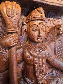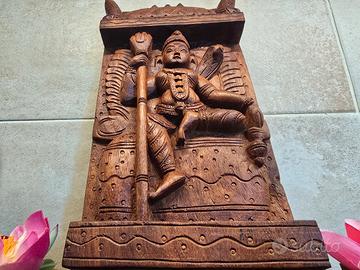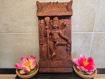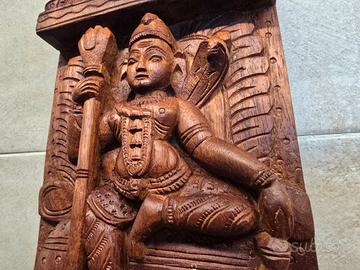 Immaginate un’antica dimora sulle pendici del sud dell’India, dove il profumo di sandalo incontra il calore del legno lavorato. Questo pannello non è solo un oggetto, ma la narrazione di Murugan, il figlio di Shiva. Conosciuto come il dio della guerra ma anche della saggezza, è qui rappresentato nella sua eterna giovinezza. Impugna la Vel, la lancia sacra che simboleggia la vittoria del bene e la profondità della conoscenza: un pezzo che porta con sé un’aura di protezione e forza interiore. Oltre al suo profondo valore storico e spirituale, questo pannello si rivela un raffinato elemento di design contemporaneo. La finitura naturale del legno e la forza del rilievo artigianale permettono di inserirlo con eleganza anche in contesti moderni. La sua versatilità è totale: può essere appeso a parete, ma grazie alla struttura solida può restare in piedi in autonomia, diventando un punto focale se appoggiato su un tavolo, una consolle o all'interno di una nicchia. Per valorizzare appieno i dettagli dell’intaglio e la matericità del legno, il posizionamento ideale è sotto un faretto LED dedicato o un’illuminazione d'accento che crei un gioco di luci e ombre, trasformando il pannello in una vera scultura luminosa. Caratteristiche tecniche: Soggetto: Divinità Murugan con Vel (Lancia di Shiva). Materiale: Legno massiccio intagliato a mano. Dimensioni: 31 cm x 16 cm. Condizioni: Ottimo stato conservativo, legno integro e venature naturali ben visibili. Un oggetto versatile, perfetto per arricchire una collezione o come idea regalo carica di significato e stile. Disponibile per consegna a mano a Reggio Emilia oppure spedizione tramite servizio TuttoSubito.
