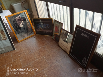 Ultime stampe da grandi a medie a piccole tre grandi con vetro per locali o taverne o camere ...un bellissima media molto creativa in blu e oro per salotto di fox un Elvis in specchio con cornice un livet whisky piccolo una rara lavagna di ardberg una per l irisch irlandese e un raro medaglione in cristallo della knokando... scozzese...si possono spedire affari ...