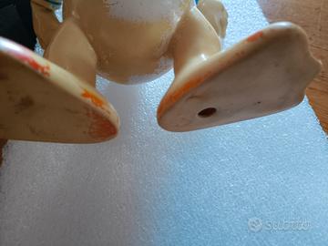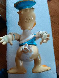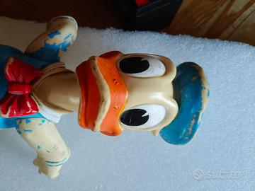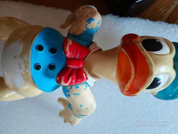 Figura vintage di Paperino Disney in vinile alta circa 28 cm. Marchio Walt Disney Productions sul retro della testa. Il fischietto sotto il piede è funzionante. Giocattolo originale probabilmente degli anni 60/70. Condizioni vintage con usura della vernice.