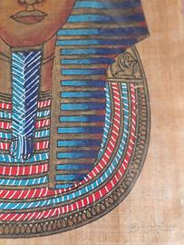 Dipinto raffigurante Tutankhamon, il famoso faraone egizio, realizzato su papiro. (il papiro era ampiamente utilizzato come supporto per la scrittura di documenti e testi sacri il papiro e ricavato dalla pianta acquatica "Cyperus papyrus" che cresce nelle zone umide dell'Africa, in particolare lungo il fiume Nilo. Questa dipinto raffigura l'antica tecnica di produzione del papiro e della vecchia storia Egizia. La pittura raffigura la maschera funeraria di Tutankhamon, uno dei re più famosi dell'antico Egitto, spesso associata alla ricchezza e all'arte egizia.