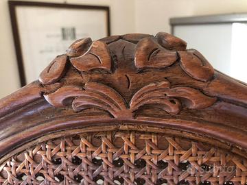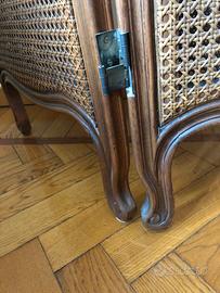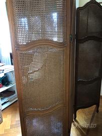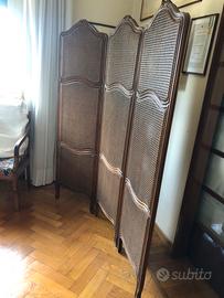 Paravento divisorio separé in stile francese composto di tre pannelli di legno e paglia di Vienna. Ogni pannello ha il doppio strato di paglia di Vienna su ambedue i lati. Ideale come divisorio o elemento decorativo. Altezza 176 cm, larghezza ogni pannello 49 cm, larghezza totale circa 150 cm. Perfette condizioni