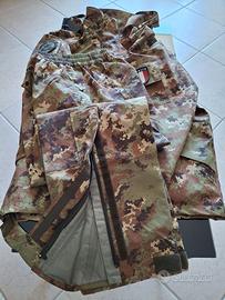 Parka giubbotto mimetico impermeabile e pantalone coordinato con bretelle elastiche. Sulle maniche esclusivi patch militari. In tessuto polyammide con trattamento esterno idrorepellente ed antivento, internamente è rivestito da tessuto microforato traspirante simile al Gore-tex. Cuciture sigillate e rivestite. Cerniera frontale a doppia direzione, ed una pattina esterna anti acqua e anti vento. Tasche e tasconi ovunque. Due cappucci di protezione: uno fisso ed uno amovibile, entrambi ripiegabili e sistemati nel colletto della giacca. Taglia 54 idonea per chi è alto circa 180 cm e pesa circa 85 kg. Per chi lo richiede, è possibile inviare misure specifiche dettagliate di ogni singolo capo di abbigliamento. Usi molteplici: collezionismo, escursionismo, nautica, pesca, caccia, soft air, sport, altro.