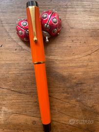 La penna è in resina arancio, con la clip in oro 18 carati recante l'incisione Parker e l'indicazione del luogo di produzione USA.