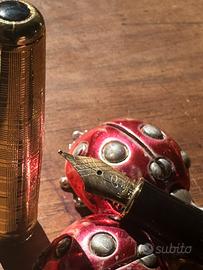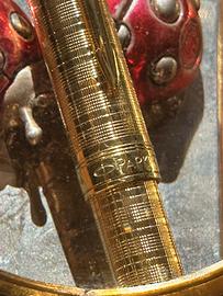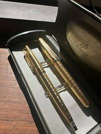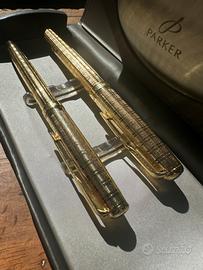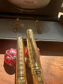 rara parure Parker, modello Sonnet, placcata in oro 23 carati, con fine lavorazione a cesello, a raffinato disegno Prince of Wales (è lo stesso della rara Parker 75). La stilografica ha il pennino Parker in oro 18 carati punta fine (in foto) e cabochon jewel sul cappuccio. La penna a sfera con la stessa lavorazione placcata in oro 23 carati, ha il refil originale Parker nuovo funzionante, il sistema di apertura è a torsione. Con scatola e garanzia. Le penne si presentano in eccellente stato di conservazione, con una finitura generale molto pulita e ben preservata. Il corpo ed il cappuccio placcati in oro 23k cesellato mantengono una lucentezza profonda ed un disegno uniforme, senza crepe, rotture né deformazioni strutturali. All'ispezione visiva non si rilevano neppure micro-segni superficiali neppure lievi, proprie di un mancato uso o di una manipolazione occasionale. La doratura è intensa ed omogenea, senza perdite di materiale, né usura. Nella bacheca altre penne esclusive (cliccare su EXCLUSIVA. Con scatola Parker e garanzia (non timbrata). Stante il valore la penna viene spedita solo a clienti con adeguate valutazioni. È parte di una grande collezione di un gentiluomo che abbiamo l'onore di trasferire a persone ricercate. Buona scelta
