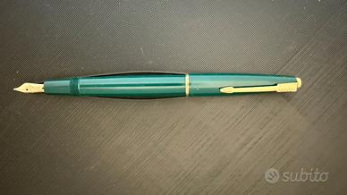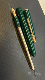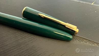La penna è stata appena revisionata dal Pennaio di Firenze ed è tutta originale. In resina verde costruita in Inghilterra sul sistema di carica Aereometric con un pennino in oro 14 kt. Le rifiniture metalliche sono laminate in oro, la chiusura del cappuccio è a vite.