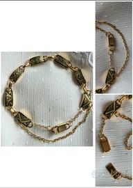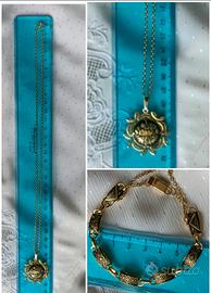 Parure vintage, risalente ai primi anni 80, composta da collana con ciondolo + bracciale. Sono gioielli eseguiti artigianalmente con la tecnica decorativa del damaschino (o damascato), tipica della tradizione locale di Toledo (Spagna), da dove provengono.