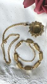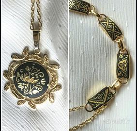 Parure vintage, risalente ai primi anni 80, composta da collana con ciondolo + bracciale. Sono gioielli eseguiti artigianalmente con la tecnica decorativa del damaschino (o damascato), tipica della tradizione locale di Toledo (Spagna), da dove provengono.