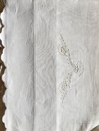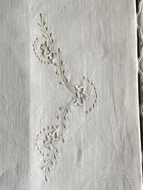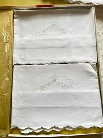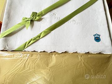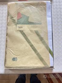 Vendo splendida parure lenzuola superiore ricamato e due federe ricamate Giori, modello Giglio disegno 63, ancora nella confezione originale e assolutamente mai utilizzata. Realizzata in puro lino ricamato, certificato dalla Commissione Tutela Lino (n. 409563).La decorazione presenta eleganti tralci sinuosi ricamati in bianco su bianco con bordo a festoncino. Le federe hanno un delicato motivo floreale centrale. Un pezzo raro di alta qualità italiana degli anni '70, perfetto per chi ama la biancheria vintage di pregio o da collezionare.Peso Kg1,935 Lunghezza cm 50 Larghezza cm 35 Altezza cm 3Confezione originale integra,Certificazione puro lino inclusa,Ricamo bianco su bianco fatto a macchina di alta manifattura,Bordo a festoncino,Made in Italy Giori. Per ulteriori foto o info non esitate a contattarmi