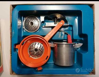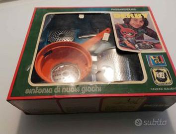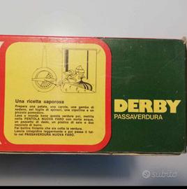 Passa verdura giocattolo in metallo Derby, anni 70, completo in scatola originale. Gioco vintage, oggetto da collezione.