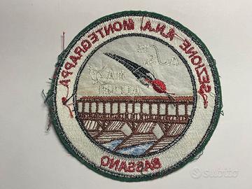 Patch - stemma vintage, dell'A.N.A. (Associazione Nazionale Alpini) sezione Monte Grappa di Bassano del Grappa, ricamato su fondo panno sombrod di colore verde, come da immagine allegata. Misura finito diametro 9,50 cm..