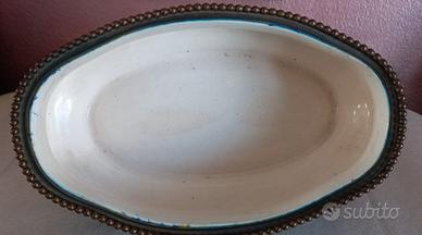 Paul Millet (1870-1950) Sevres , centrotavola ovale firmato sul fondo MP ( firma usata dal 1911 al 1930) nel suo caratteristico smalto Blue Flambè, sorretto da quattro piedini bronzo dorato e cesellato con festoni floreali sul bordo superiore sempre in bronzo dorato cesellato .Condizioni perfette dimensioni cm .20 x cm 12 x cm 10,50. Vendo euro 180. Non spedisco . Gradito contatto telefonico wapp. Cell 3478314154.