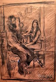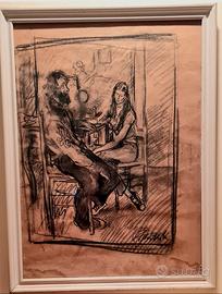 Paulo Ghiglia Grande studio carboncino su carta 55x40 prima del dipinto,"Conversazione" anni60' con cornice Paulo Ghiglia(Firenze,5 marzo1905–Roma,19 novembre1979) è stato unpittoreitaliano. bibliografia Inizia a dipingere giovanissimo con il padre e maestroOscar; a vent'anni abbandona la casa paterna e si trasferisce allaVerna, dove vive per circa cinque anni. Esordisce aMilanonel1929allaGalleria Pesaroinsieme al padre Oscar e al fratelloValentino, anch'egli pittore. Nel1931è alla primaQuadriennale di Roma: grazie aPetrolini, suo amico fraterno, viene introdotto nella capitale, dove inizia il periodo dei ritratti. Soggiorna aParigidove ritraeJoséphine Baker. Nei mesi estivi era solito recarsi nel borgo diPratovalle, frazione del comune diLoro Ciuffenna, inprovincia di Arezzo, insieme al fratello e pittoreValentino Ghiglia, che fu colpito maggiormente dal luogo e lo rappresentò in molte sueopere[1][2][3]. Torna a Roma, che rimarrà, insieme a Firenze,Livornoe La Verna, il luogo di maggiore ispirazione, neglianni quarantaecinquantala sua produzione si concentra sui ritratti di persone illustri, di scimmie e diIsa Miranda. Neglianni sessantasoggiorna a lungo inCalifornia, aLos AngeleseSan Francisco, ritraendo il mondo delcinemadiHollywood; alla fine del decennio si trasferisce nuovamente alla Verna, inToscana, lì una nuova pittura di indirizzoimpressionistalo porterà a grandi mostre pubbliche tra le quali quella di Firenze nel1973aPalazzo Strozzi, a Roma alPalazzo delle Esposizionidella Quadriennale, e nel1975adAssisicon una grande mostra suSan Francesco. Le sue opere sono esposte in vari musei del mondo: allaGalleria degli UffizidiFirenze, che ospita due autoritratti, alMetropolitan Museum of ArtdiNew York, al Museo della Scala diMilano, allaGalleria d'Arte Moderna Ricci OddidiPiacenza, al Museo d'arte moderna diLivorno, allaGalleria d'Arte ModernadiPalazzo Pitti, alla fondazione Balzan, alla Fondazione Carima e al