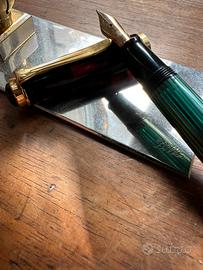 Pelikan stilografica, modello M400 Souverän, si tratta del raro modello con fusto in resina verde su verde. Il serbatoio trasparente, infatti, non è nella nota lavorazione in resina a righe verdi e nere, ma in pregiata resina trasparente verde, con righe satinate verdi: splendida. Il sistema di caricamento è a stantuffo. Il pennino è in oro 14 carati decorato, misura M (media). Cappuccio in resina pregiata nera con anello in oro 24 carati con iscrizione Pelikan Germany, il fermaglio è disegnato a becco di pellicano ed è placcato in oro 24 carati. La penna si presenta in eccellente stato di conservazione, con una finitura generale molto pulita e ben preservata. Il corpo ed il cappuccio in resina mantengono una lucentezza profonda ed uniforme, senza crepe, rotture né deformazioni strutturali. All'ispezione visiva si possono apprezzare micro-segni superficiali molto lievi, proprie di un uso attento o di una manipolazione occasionale, visibili solo sotto luce diretta e senza impatto estetico nel complesso. Gli elementi placcati in oro 24 carati (clip, anelli e dettagli) conservano un dorato intenso ed omogeneo, senza perdita di materiale, né usura significativa. Nel complesso si tratta di un esemplare ben conservato, funzionale e pronto all'uso, che rappresenta fedelmente la qualità e la durabilità per cui il modello Pelikan 400 Souverän è considerato una delle stilografiche più emblematica del XX secolo. Sarà spedita in una confezione di cortesia per la corretta conservazione. Stante il valore la penna viene spedita solo a clienti con adeguate valutazioni. È parte di una grande collezione di un gentiluomo che abbiamo l'onore di trasferire a persone ricercate. Altrimenti nella bacheca c'è molto altro (basta cliccare su EXCLUSIVA).