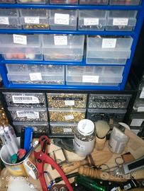 taglia strisce cuoio, diversi punzoni taglio e lettere per battitura e punzoni per decorare, fibbie varie, e molta minuteria metallica, vari pezzi di pelle e cuoio,etc..
