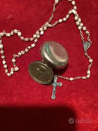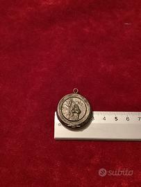 Vecchio pendente o portacorona in metallo argentato contenente una piccola corona dove sicuramente è stato cambiato l’anellino che tiene la croce e forse anche quella. Il coperchio del ciondolo è un pochino incurvato ma si chiude. Raffigura la Madonna ai piedi della croce. Condizioni discrete
