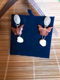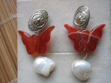 Pendenti particolari e unici,composti da antichi ovali d'argento 925, liberty originali,decorati con ragni e fiori cesellati a mano ,che sorreggono le farfalle di corniola scolpita,con perle mabè naturali in finale:bellissimi!Pendenti davvero belli, ricchi e originali,veri pezzi unici.Gancio a farfallina x lobi forati,misurano cm 4,5 di lunghezza,cm 2,5 di larghezza,pezzo unico!Spedisco ovunque,la consegna avviene tra le 24 ore e i 5 giorni,secondo la formula che sceglierete.