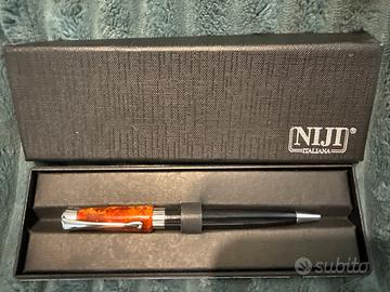 Penna a sfera con scatola, con il marchio "NIJI ITALIANA" visibile sulla scatola.