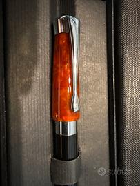 La penna presenta un corpo bicolore, con la parte superiore di colore rosso/marrone marmorizzato e la parte inferiore nera, con finiture argentate. Un segno di usura.