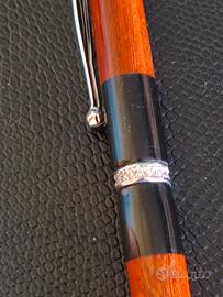 Bellissima penna biro realizzata a mano in legno bicolore di ebano nero e bocote, con anellino in prezioso Swarovski cromato. Astuccio in legno personalizzabile con nome o disegno. Prestigioso regalo con un pezzo unico e irripetibile. per signora o per collezione.