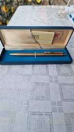 Vendo elegante penna a sfera Cross placcata in oro, in ottime condizioni e perfettamente funzionante. Viene fornita con la sua custodia originale blu e il manuale d'uso. Ideale per un regalo o per gli amanti degli strumenti di scrittura di alta qualità.