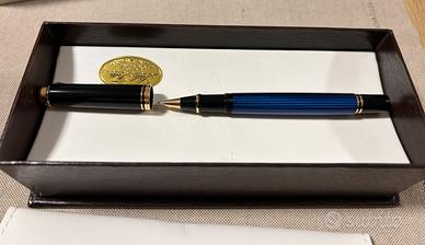 Corpo in acetato di celluloide blu rigata con effetto semitrasparente, cappuccio in resina nera.