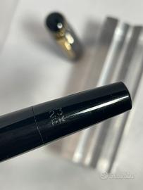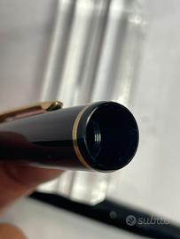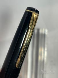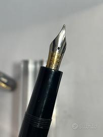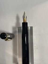 Penna Stilo Artus 23 in resina nera e finiture gold, produzione Lamy anni ‘50. Sistema a pistone , finestra a ovali trasparenti. Pennino laminato oro, FK. Lunga cm 13