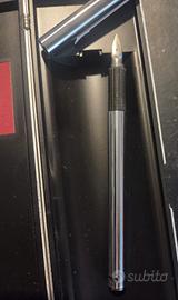 Prestigiosa penna Aurora Hastil, un'icona del design italiano. Progettata dal celebre architetto Marco Zanuso nel 1969, è stata la prima penna stilografica ad essere esposta al MoMA (Museum of Modern Art) di New York, dove fa parte della collezione permanente per il suo design innovativo. Realizzata in acciaio (Ecosteel), presenta una forma cilindrica sottile e minimalista. Dotata di un pennino in oro bianco 14 kt. L'astuccio visibile nell'immagine è quello originale di metallo, ivi inclusa la scatola esterna in cartone rosso.