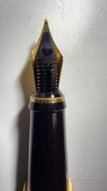 Nel particolare è presentata una stilografica grigia marmorizzata, con le finiture dorate e il pennino in acciaio dorato.