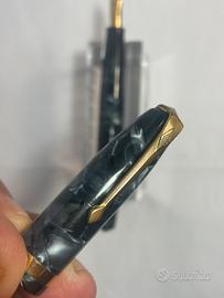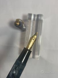 Stilo Conway Stewart 84 made in England anni 50, in celluloide marble blu e finiture gold. Pennino oro 14 Kt M, sistema a leva laterale. Cm 12