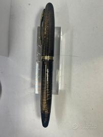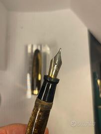 Stilografica Stilpen in celluloide righe striate colore brown, finiture gold sul cappuccio. Pennino originale laminato oro punta F flex. Sistema a pulsante funzionante. Lunghezza cm. 12,8