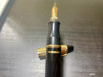 Vendo penna stilografica con tappo e pennino colore oro marca Marksman; la penna è esteticamente perfetta, il pennino funziona e non presenta danni, solo qualche lieve segno estetico dovuto al tempo.