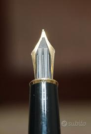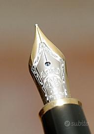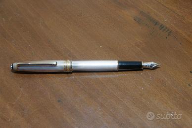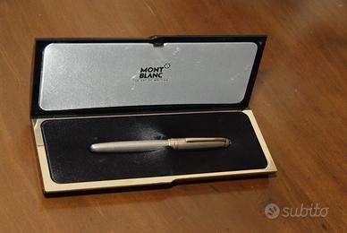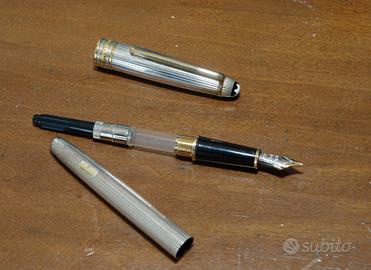 Prestigiosa penna Stilografica MontBlanc Solitaire in argento massiccio mai usata con astuccio MontBlanc, non sono sicuro sia il suo. Carica a cartucce o converter originale MontBlanc incluso. Pennino in oro massiccio bicolore 18 Kt. punta F Se siete interessati a penne stilografiche e/o biro date un occiata agli altri miei annunci.