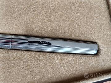 penna stilografica OMAS modello Mustang, marchio storico italiano. Il corpo della penna è argentato con un motivo rigato. E' presente la sua scatola originale.